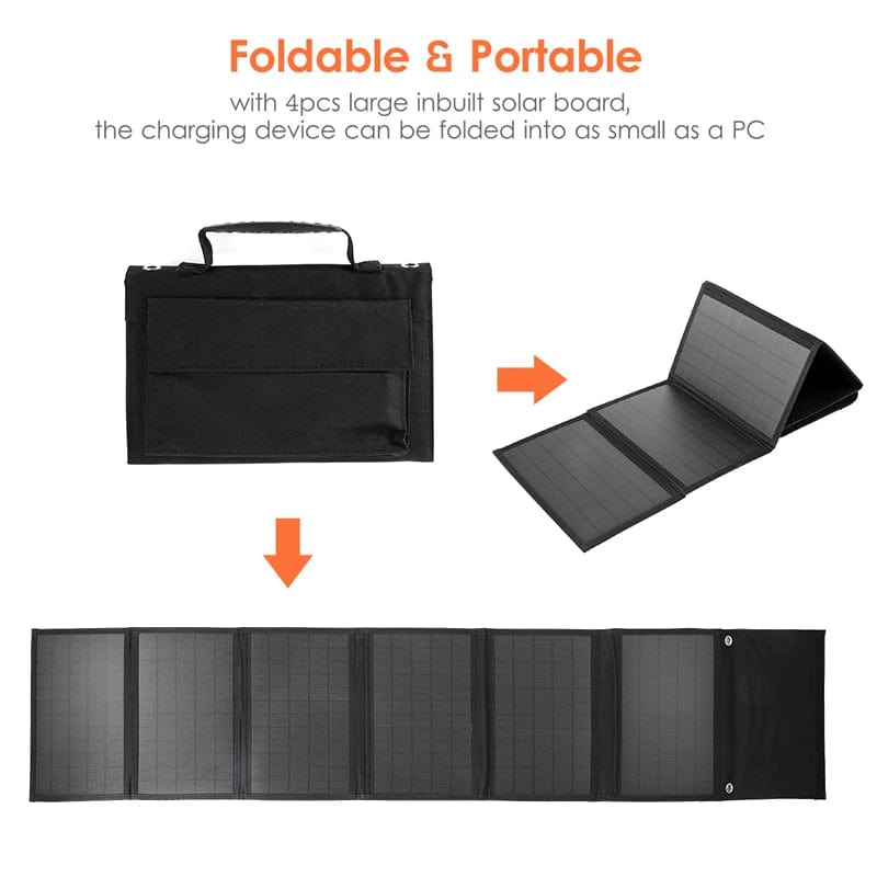 Foldable and portable: Built-in 4Pcs solar panel, the charging device can be folded into a tablet as small as a tablet, and it is designed with hanging holes, which can be easily hung in the backpack with the provided climbing clip.