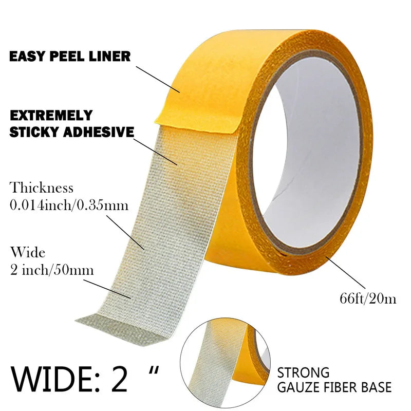 Cloth double - sided film, strong, high adhesion, soft, constant tension. Products are widely used, all kinds of carpet splicing fixed, Spring Festival couplet paste, lights balloon fixed, home use (such as socket fixed, picture frame fixed, pendant fixed, etc.).