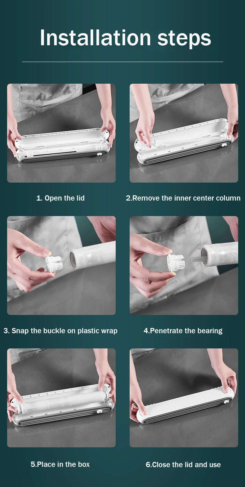 QUALITY MATERIAL: Plastic wrap dispenser with cutter is made of ABS material, durable and odorless. It is reusable and long-term use without deformation. We will provide after-sales service for customers if buyers have any questions about product. Pay attention to the wrap size before purchasing.